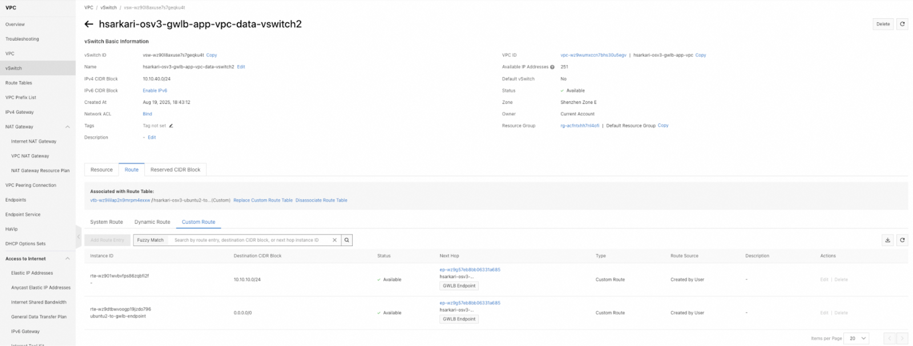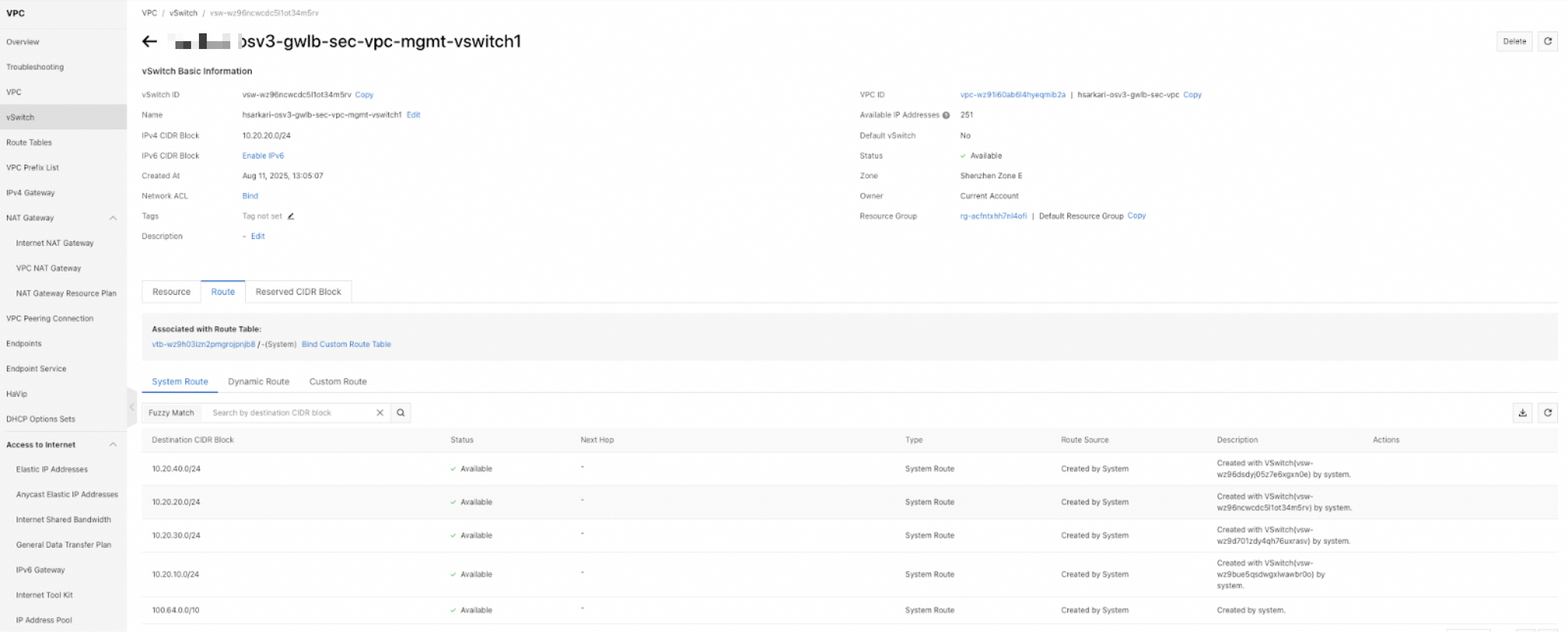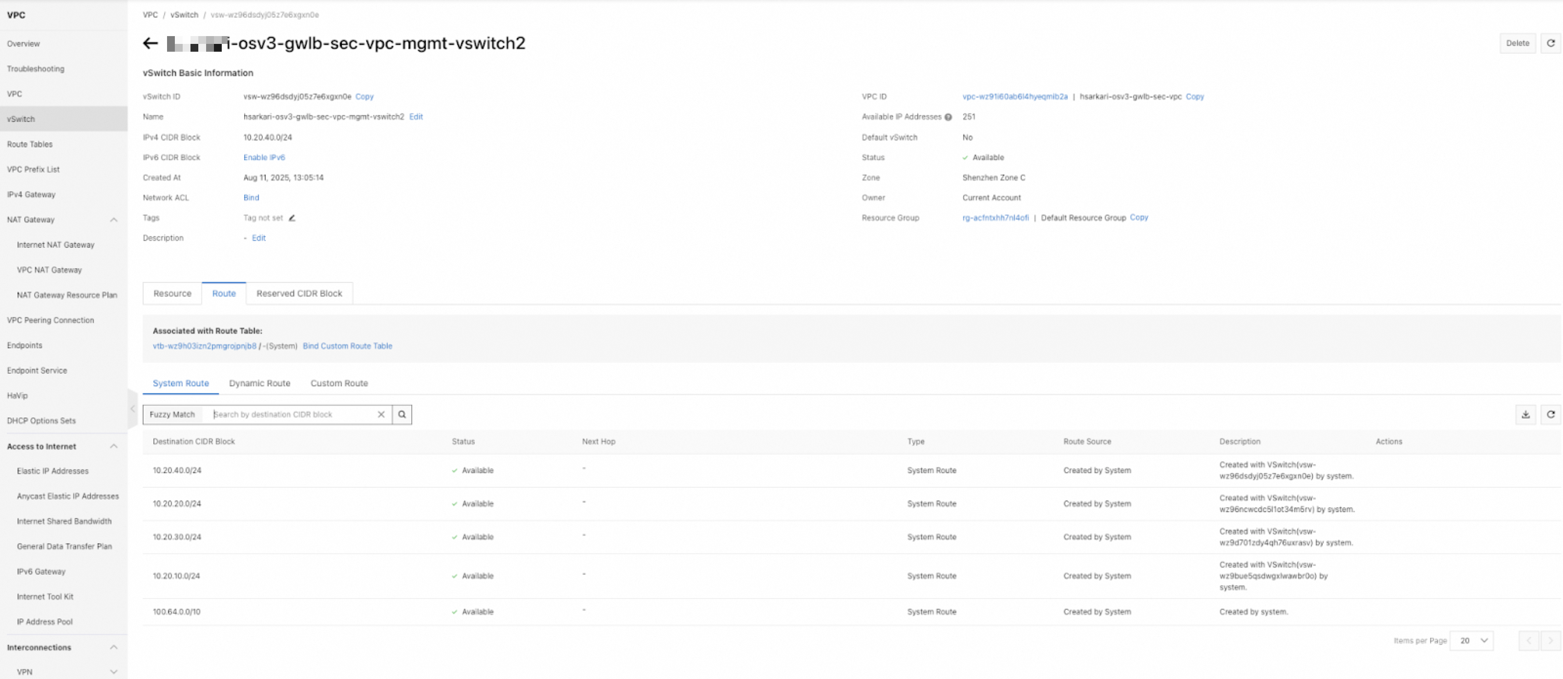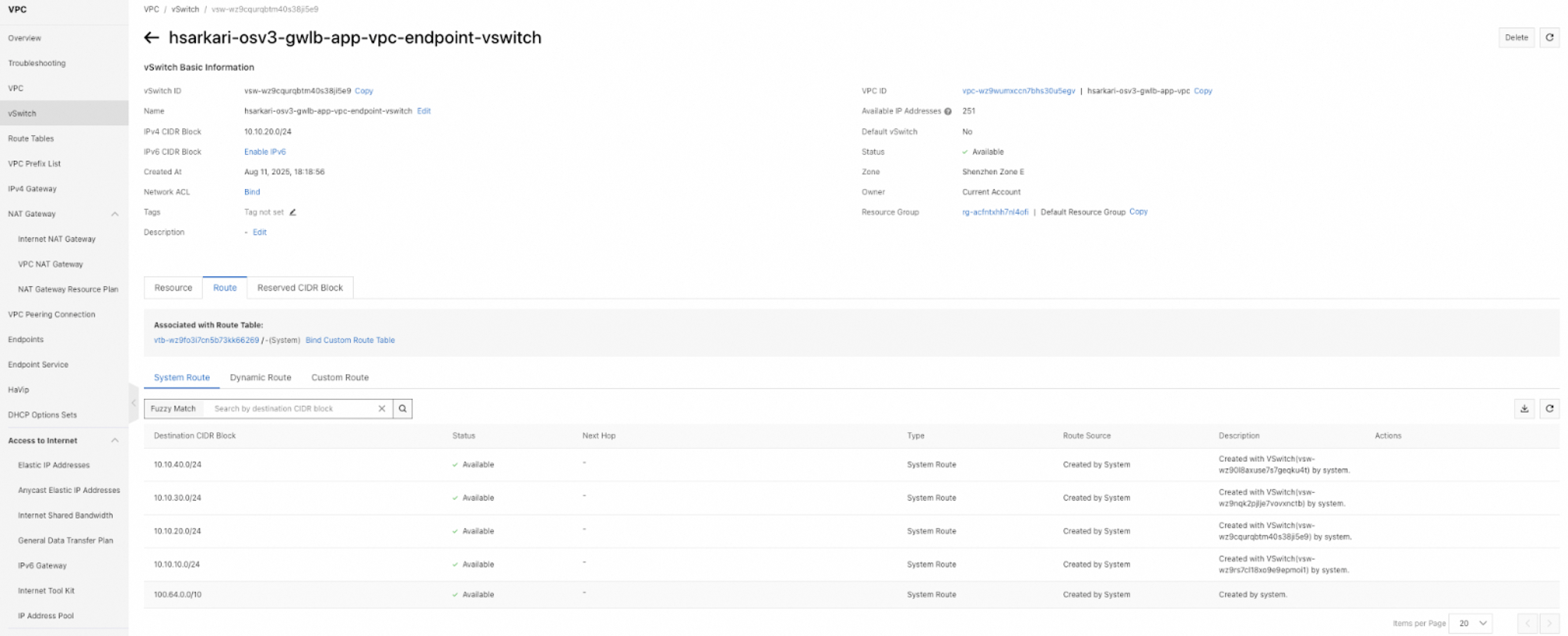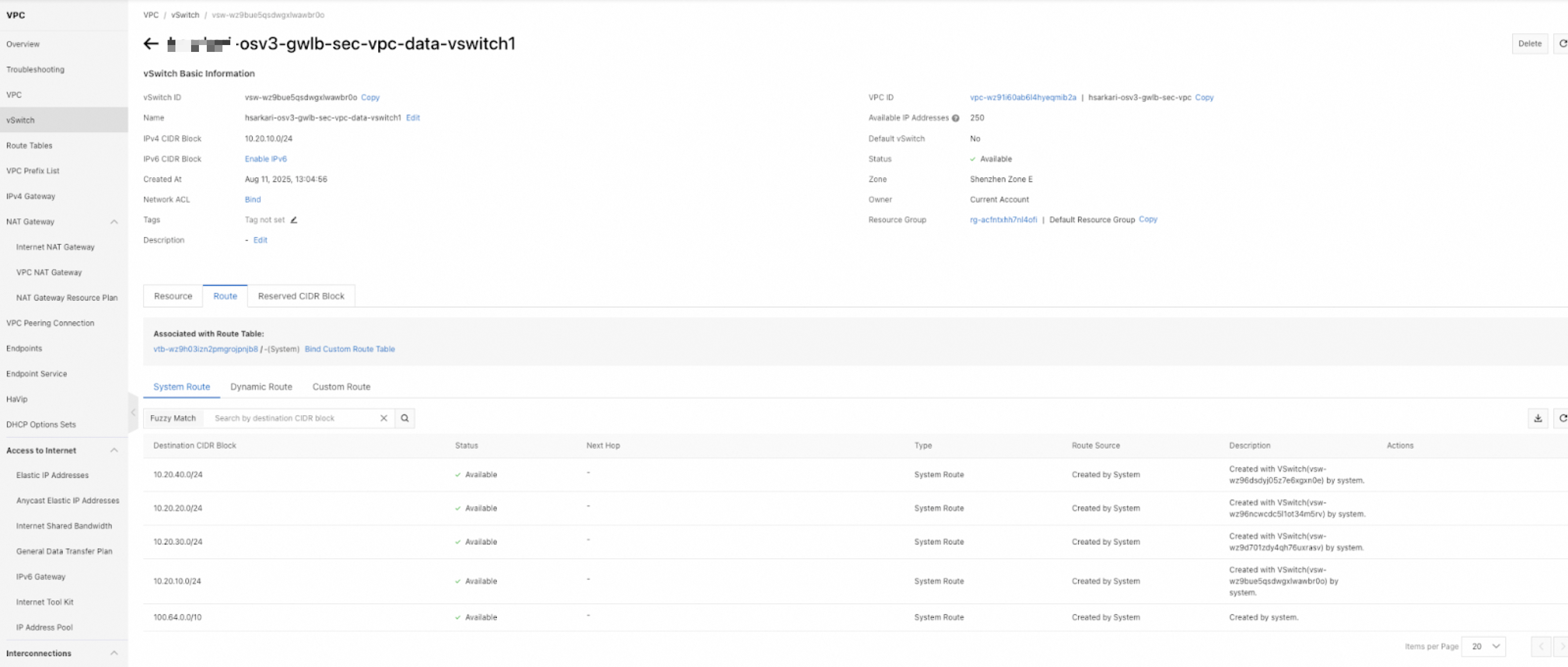 4. Click the System Route tab on the Route Entry List tab of the Route Table Details page, and view the routes that are created by the system. Routes destined for the CIDR block of a vSwitch of the VPC to which the route table belongs are automatically added by the system to a custom route table. These routes are used for communication between cloud resources within the vSwitch.