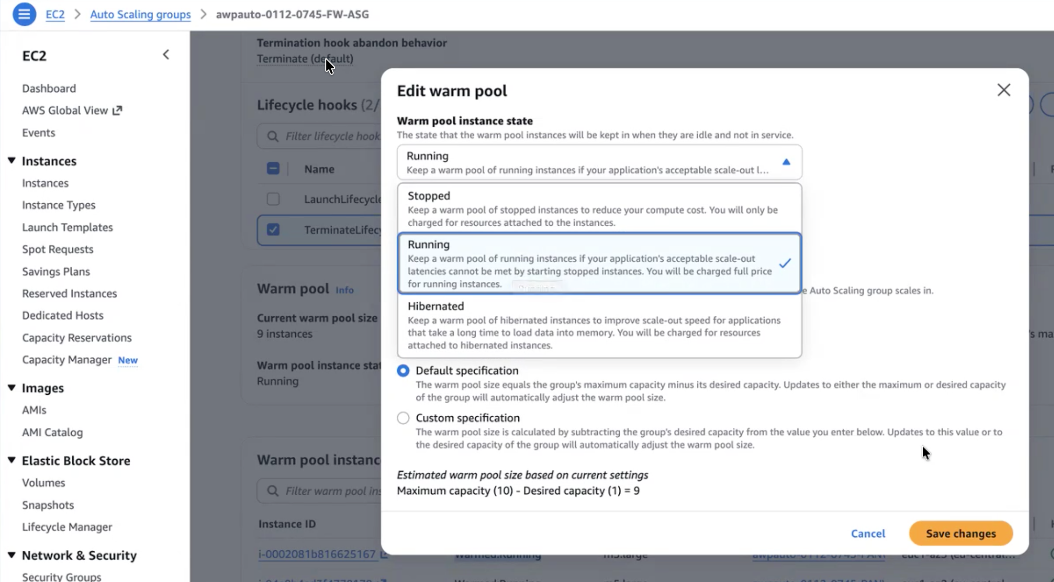- Select Running in the warm pool instance state drop-down and click Save changes.