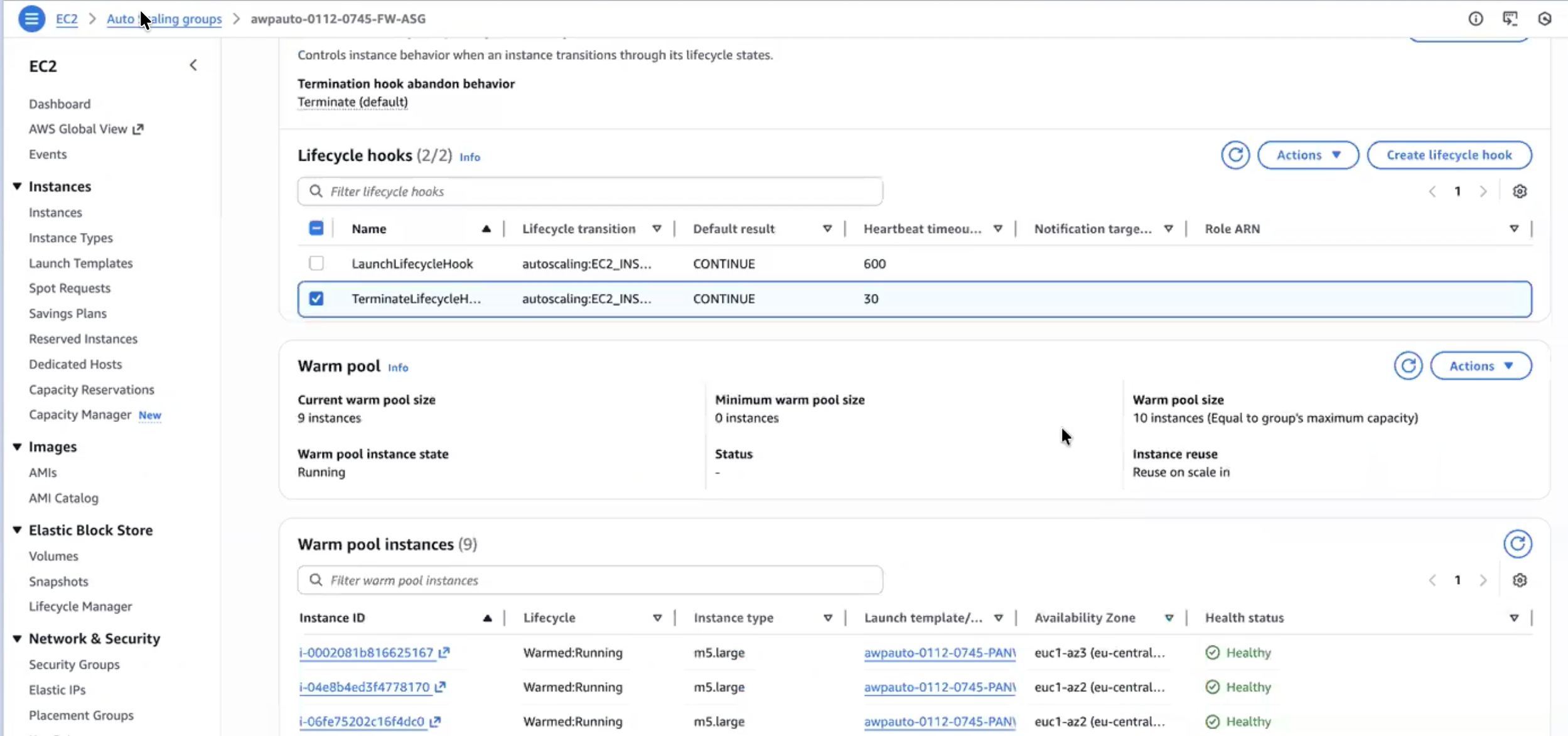 - Deploy your AWS Auto Scaling Group (ASG) with Warm Pool configuration.Configure the warm pool settings within your ASG. The Warmed:Running state ensures the firewall is fully booted and ready to receive configuration, which is essential for rapid scale-out.