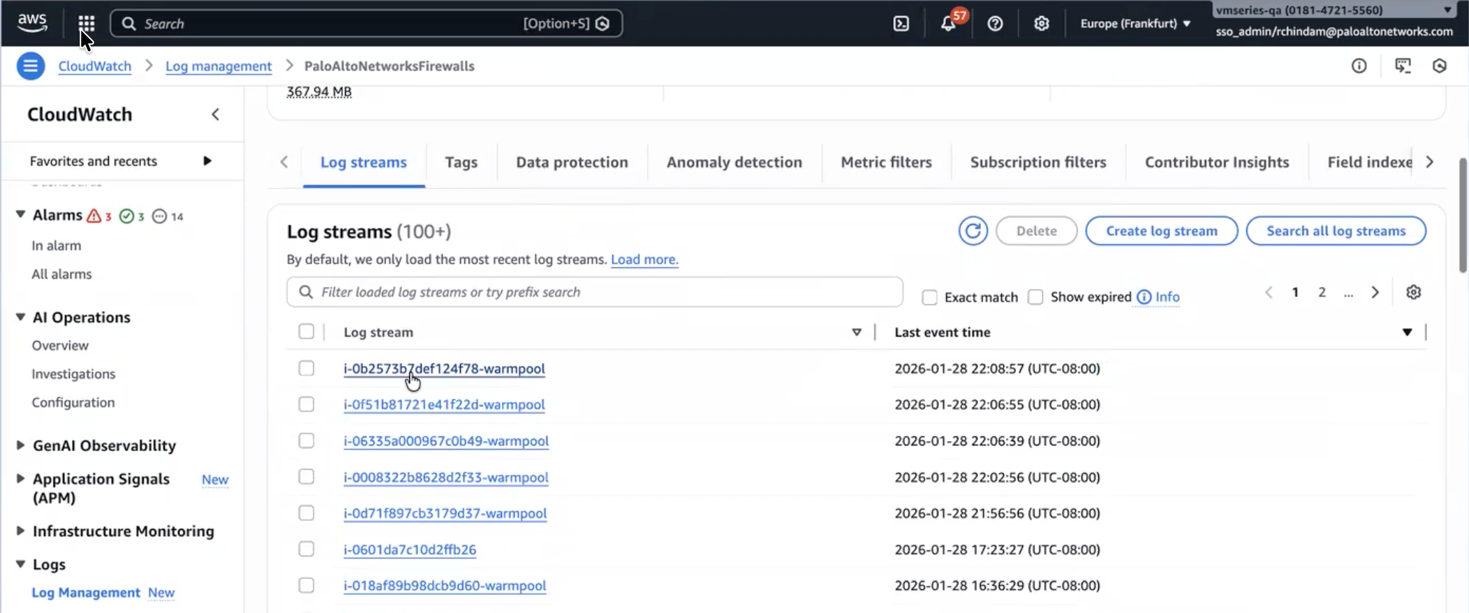 - Search for the log group named PaloAltoNetworksFirewalls.