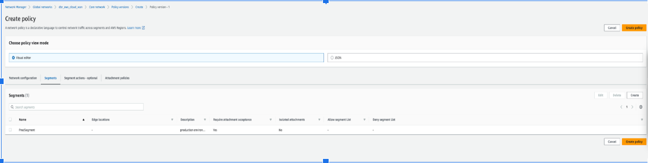 - While creating the core network, ensure that you add all the regions your VPCs are configured to, in the Edge locations section under core network policy settings. You will also need to create segments and add the type of segment (Dev, Prod, Management or Security) that these regions belong to, under segment name.