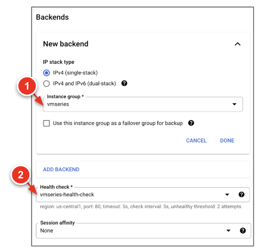 Here is an example:gcloud compute health-checks create tcp vmseries-hc \ --request=/php/login.php \ --port=80 \ --region=us-central1 gcloud compute backend-services create vmseries-external-lb \ --load-balancing-scheme=EXTERNAL \ --protocol=TCP \ --health-checks=vmseries-hc \ --health-checks-region=us-central1 \ --region=us-central1 gcloud compute backend-services add-backend vmseries-external-lb \ --instance-group=vmseries-us-central1-a \ --instance-group-zone=us-central1-a \ --region=us-centrallCreate a forwarding rule for each application.