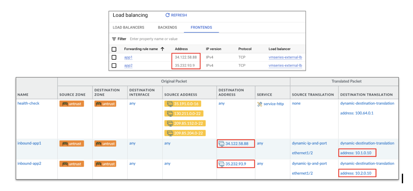 gcloud compute forwarding-rules create app1 \ --load-balancing-scheme=EXTERNAL \ --region=us-central1 \ --ports=ALL \ --backend-service=vmseries-external-lb gcloud compute forwarding-rules create app2 \ --load-balancing-scheme=EXTERNAL \ --region=us-central1 \ --ports=ALL \ --backend-service=vmseries-external-lbClick Create.On your VM-Series firewall web interface, create two NAT policies to IP map the load balancer forwarding rule address to the correct internal application.