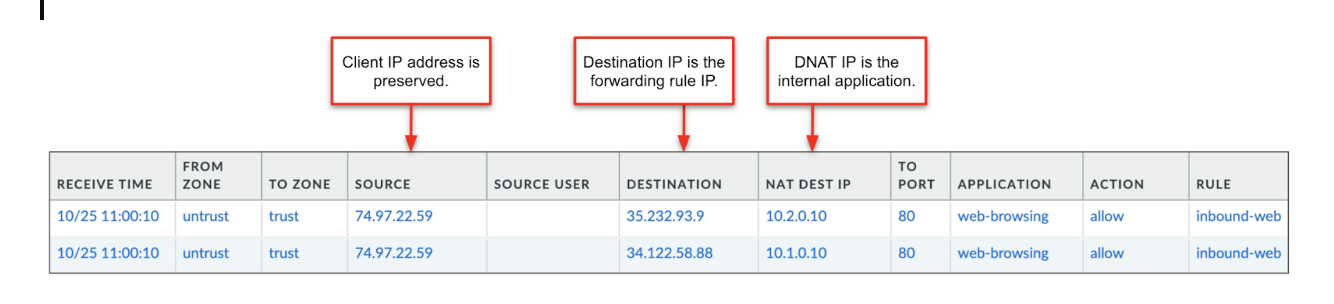Automation Example:Below is a Terraform code sample that automates the manual steps above.A forwarding rule is created on an existing external TCP load balancer. The forwarding rule address is used within the VM-Series NAT policy to map to a backend application.# Create GCP LB forwarding rule resource "google_compute_forwarding_rule" "default" { name = "my-forwarding-rule" target = var.target region = "us-central1" load_balancing_scheme = "EXTERNAL" all_ports = true } # Create VM-Series NAT policy resource "panos_nat_rule_group" "main" { provider = panos position_keyword = "bottom" rule { name = "my-nat-policy" original_packet { source_zones = ["untrust"] destination_zone = "untrust" destination_interface = "ethernet1/1" service = "any" source_addresses = ["any"] destination_addresses = ["${google_compute_forwarding_rule.default.ip_address}"] } translated_packet { source { dynamic_ip_and_port { interface_address { interface = "ethernet1/2" } } } destination { dynamic_translation { address = "<ip-address>" } } } }