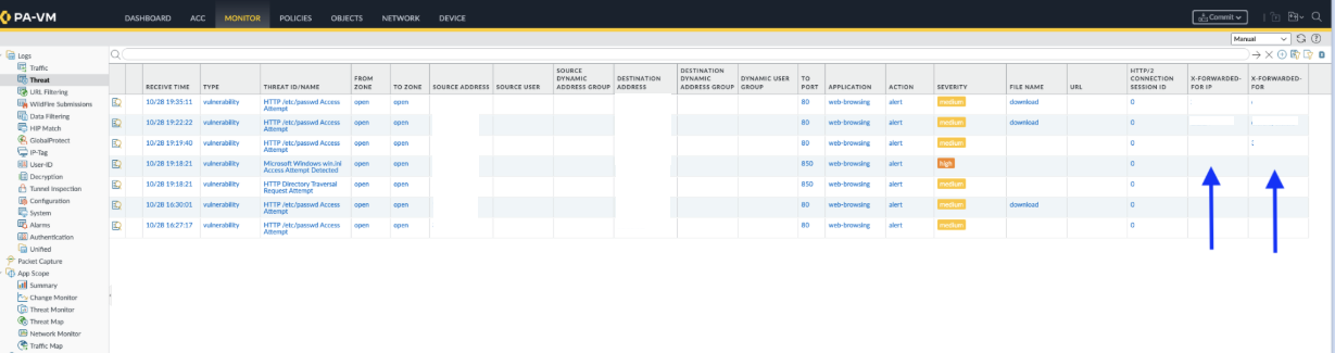 - View Logs (UI): Once configured, you can view the populated X-Forwarded-For and XFF IP fields in the Monitor > Logs > Threat log viewer. You can also configure a Syslog Server Profile to forward these logs.