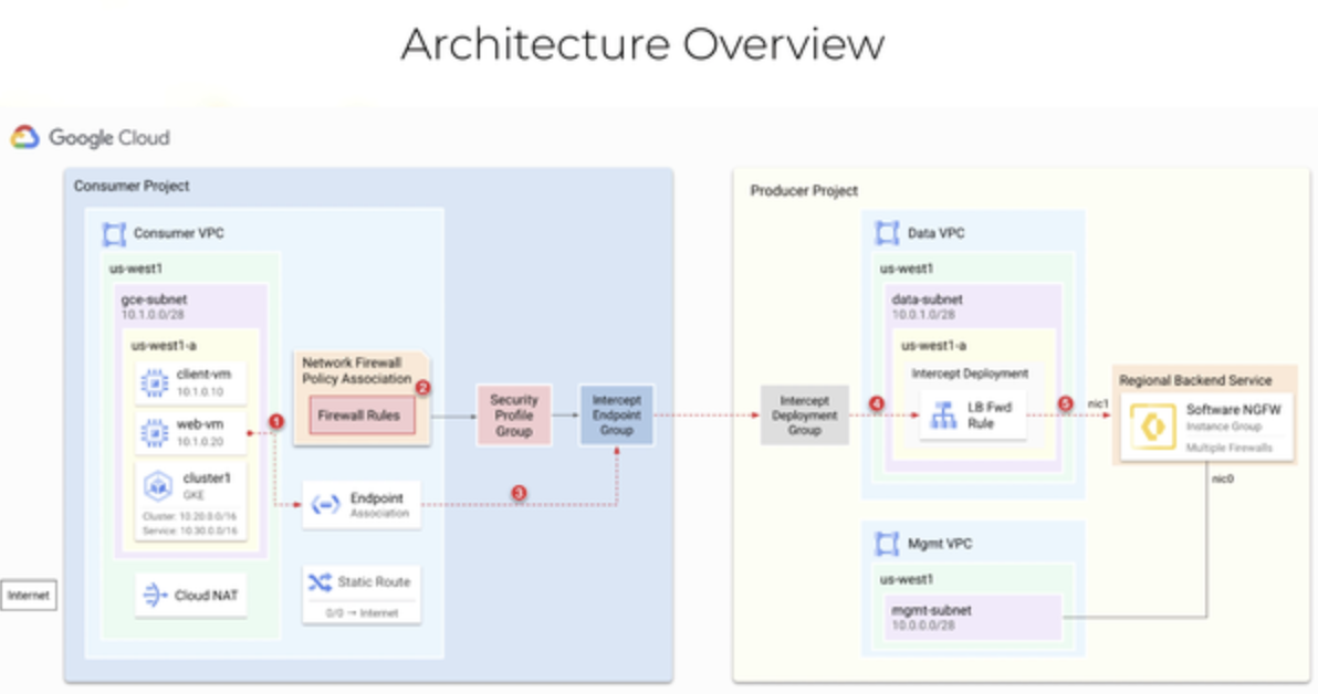 This step deploys the inspection service tied to the endpoint and deployment groups.Configure Firewall Rules in Consumer VPCs.- In each consumer VPC, configure firewall rules to permit traffic destined for the Intercept Endpoint Group.