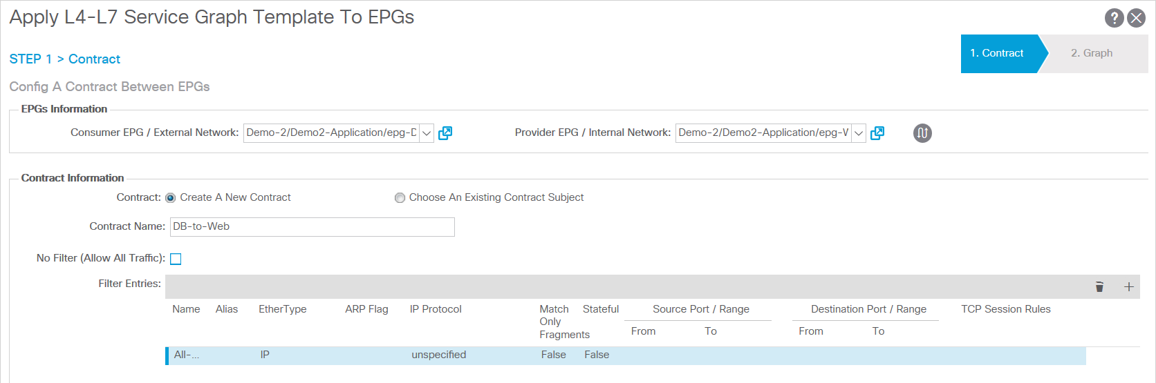 - Clear No Filter (Allow All Traffic). Using this option is not recommended. To allow all traffic between the EPGs to be redirected to the firewall, it is recommended that you create a filter to do this.