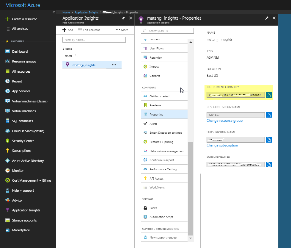 the firewall and copy the Instrumentation Key from ConfigureProperties.The firewall needs this key to authenticate to the Application Insights instance and publish metrics to it. Make sure to review the permissions required for the service principal in VM-Series on Azure Service Principal Permissions.