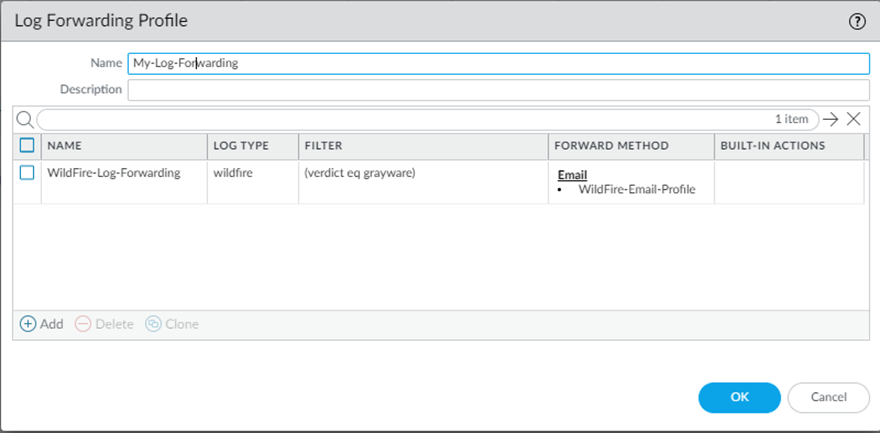 - Select ObjectsLog Forwarding.Add and name the profile, for example, WildFire-Log-Forwarding. Optionally, you can add a Description of the log forwarding profile.Add to configure forwarding methods.