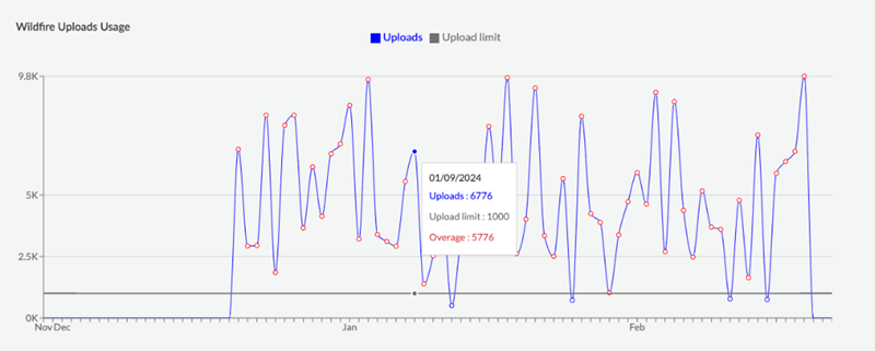 - WildFire Uploads Usage—This chart displays the WildFire API upload usage. You can optionally select Upload limit to set a visual indicator for your license limitation for WildFire API uploads. Hovering over the chart produces a tool tip which displays a data point for the number of Uploads and any Overage occurrences for a given day.