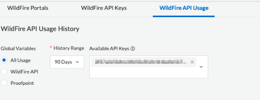 - Available API Keys—Select one or more WildFire API keys for which to view the API history. You can remove an added WildFire API key by clicking on the 'x' next to the API entry.