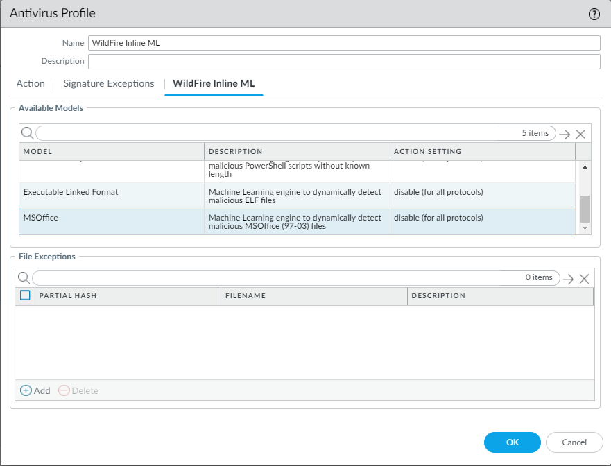 - Select WildFire Inline ML and apply an Action Setting for the new WildFire inline ML model. This enforces WildFire inline ML Actions settings for each protocol on a per-model basis. In addition to the currently available classification engines (Windows Executables, PowerShell Scripts 1, and PowerShell Scripts 2, Executable Linked Format), MSOffice should now be available. If this model is unavailable, verify that you have content release 8434 or later installed on the firewall.