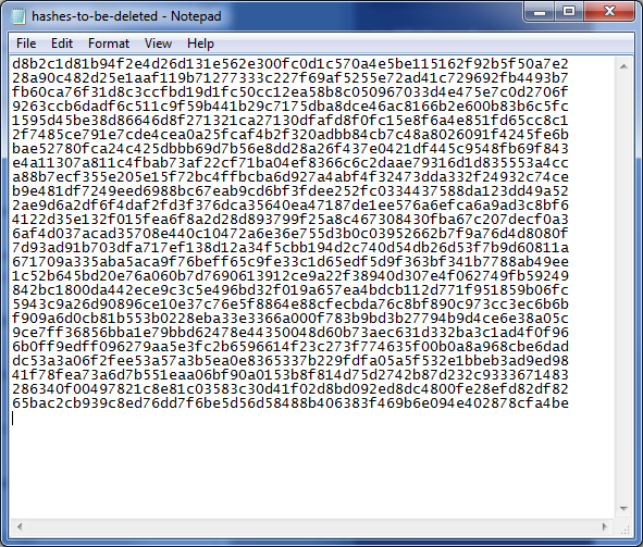 - Create a text file with a list of SHA256 or MD5 hashes of the samples to be deleted. Each hash must be on an individual line in the file and can include up to 100 samples.Only files that are unique to your environment can be deleted. If files are found to be available in other public or private feeds, only the session and upload data for a given account is removed.