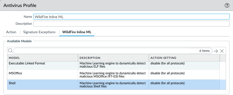 - Select WildFire Inline ML and apply an Action Setting for the new WildFire inline ML model. This enforces WildFire inline ML Actions settings for each protocol on a per-model basis. In addition to the currently available classification engines, Shell should now be available. If this model is unavailable, verify that you have content release 8543 or later installed on the firewall.